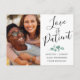 This simple but elegant custom wedding postponement postcard features a modern design template with your photo on the left and to the right it reads in hand lettered black script "Love is Patient" with your names and message to personalise accented by a sprig of eucalyptus greenery. On the back of the postcard is more details of your new wedding day to customise. Best of wishes for your engagement and wedding! Designed by Susan Coffey.