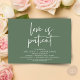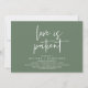 This is the Wedding party invitation Rescheduled (postponed / postponement) card (Love is patient), change the date card, in the modern minimal romantic simple clean design sage green theme. It is the perfect way to make the event reschedule announcement to your friends and family.