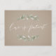 Modern wedding postponement postcards feature "Love is patient" calligraphy and rustic watercolor foliage greenery design on rustic kraft paper background, simple and elegant, inform your wedding guests the updated information with this announcement.