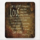 This attractive design features lines from 1 Corinthians 13:4, "Love is patient, love is kind...", randomly placed across a deep neutral toned background.
