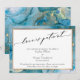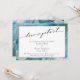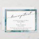 If your wedding plans have unavoidably changed, this striking artistic card could be the unique option for you. Featuring a luxury calligraphy font, the header reads "love is patient". The front's border and the back of the card are covered in a piece of my abstract "liquid art" featuring a technique achieved by using teal "alcohol inks" accented with metallic gold. The style is sometimes mistaken for watercolor. The front details are also offset by a double gold border overlaying a white rectangle. Use the template fields to add your personal details. // 137 //