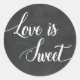 Modern and trendy wedding stickers with a cute white typography design that says Love is Sweet on a faux black chalkboard printed background. Pretty and cool labels to use on wedding favours.