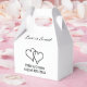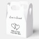 Love is sweet double heart wedding logo custom Favour Boxes. Cute two hearts one love design with names of bride and groom plus date of marriage. Romantic interlocking love icons with fun tagline. Great for desserts, treats, cake, sweets, cookies, cupcakes, doughnuts etc. Add your own quote or slogan optionally.