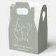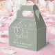 This sage green minimalist elegant script wedding favour box can be personalised with your information in chic typography. Designed by Thisisnotme©