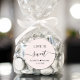 Chic light pink sticker for your wedding reception favours featuring "Love Is Sweet" in simple modern typography and an elegant calligraphy script with swashes, your first names joined together by a heart and your wedding date.