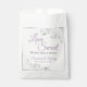 These beautiful favour bags are simple, elegant and beautiful. They feature a classy and stylish design with elegant dusty purple or lavender script lettering and silver grey frilly lace curls and swirls in the corners. The text reads: Love is Sweet, Please take a treat! There is room for your names and the wedding date below. Wonderful and thoughtful way to thank your guests for celebrating with you.
