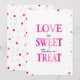 This modern "Love is Sweet Take a Treat" sign features a pink magenta background with metallic confetti. The text is written in a mix of a playful calligraphy font and a modern serif font.