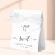Chic white favour box for your wedding that features "Love Is Sweet" in simple modern typography and an elegant script with swashes, your first names joined together by a heart and your wedding date.