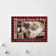 Design is composed of red and black plaid/tartan pattern. Add a custom photo of you with your pet cat. The photo is adorned above with unique gold greetings - "Meowwy Holidays"