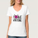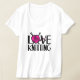 Love knitting slogan t-shirt. Featuring a heart shaped ball of wool illustration in the place of the o in the word love. A cute t-shirt ideal for knitters and knitting groups. Original graphics by Sarah Trett.