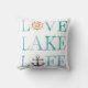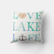 Love Lake Life Watercolor Typography Nautical Pillow. Blue and green watercolor brush stroke style typography with text reading Love Lake Life. Brown captains ships wheel and grey anchor designs on white background. Design on both sides of pillow. Nautical themed pillow great for a lake house or boat lover.