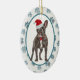 On the front of this Holiday ornament is an adorable image of a black French Bulldog wearing a red and white Santa hat and star collar. The image is placed on a white oval framed in grey blue, and bordered with a grey paw print pattern. The back of the ornament has the same border with your custom text at the centre. Currently the top line says "Love leaves Pawprints on the Heart" but you may change it to anything you'd prefer.