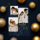 Elegant Hanukkah three photo collage card featuring an elegant typography design "Love Joy Light" in gold. Sparkling gold stars create the star of David. Artwork by Moodthology Papery.