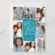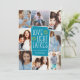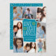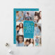Fun and festive Hanukkah photo card features eight photos arranged in a collage layout. "Love, light, latkes" appears in the centre in white lettering on a blue background accented with stars. Personalise with your names and the year.