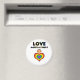 This magnet would look fantastic on the fridge of a family that supports gay rights. Drawing of a tan skinned baby hugging a rainbow heart says Love Makes a Family.