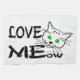 Love MEow text and a drawing of a funny cat with green eyes. Funny kitchen towel.