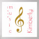 Golden musical note, a treble clef, on white background, with custom name of the music-lover in a red and modern font-style