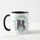 "LOVE MY BORDER COLLIE" declares this mug for the Border Collie Dog lover. Each side of the mug has a beautiful watercolor portrait of a black and white collie in a blue green leaf wreath. Between the two images is the text, which may be easily customised, or even removed, by you.