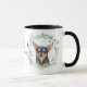 "LOVE MY CHIHUAHUA" declares this mug for the Chihuahua Dog owner. Each side of the mug has a beautiful watercolor portrait of a black and tan Chihuahua in a blue green leaf wreath. Between the two images is the text, which may be easily customised, or even removed, by you.