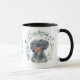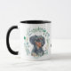 "LOVE MY DOXIE" declares this mug for the Dachshund Dog lover. Each side of the mug has a beautiful watercolor portrait of a black and tan Dachshund in a blue green leaf wreath. Between the two images is the text, which may be easily customised, or even removed, by you.