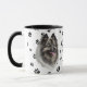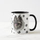 This mug for the Keeshond Dog owner features an artist's watercolor portrait of a beautiful Keeshond. The image is printed twice, and between them is an oval with the black text that says "Love my Keeshond Dog". The oval and dog images are placed on a background sprinkled with black paw prints. You may easily change the text to something else, or personalise it, if you'd like.