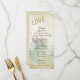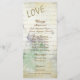 This elegant menu card features an old fashioned background of watercolor floral images in green and gold superimposed over a neatly handwritten love letter. The design is brought into the current era with a stylistic text LOVE in gold. The customised menu text is in cinnamon brown. The back of the menu card is light gold. This card matches the Love Never Fails Wedding Invitations in our store. Beautiful!