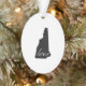 Featuring the silhouette outline map shape of the state of New Hampshire filled in with a solid black background and the word love written in lower case letters inside, this state love themed Christmas ornament is perfect for anyone who loves New Hampshire and wants to share it on their tree this holiday season.