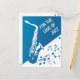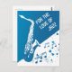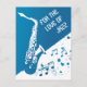 This postcard features a blue-white dominant colours, a flat saxophone illustration, musical notes, blue hearts and the customisable default text "for the love of jazz". It is a great design for music and jazz lovers!