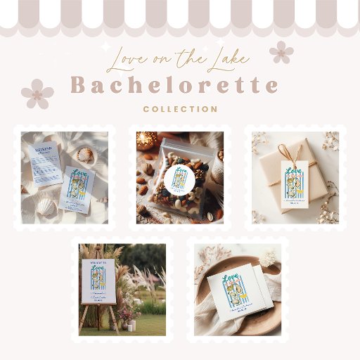 Celebrate a lakeside bachelorette weekend with this charming coastal design featuring hand-drawn seashells, jellyfish, and a lighthouse in classic nautical blue. Perfect for adding a personal touch to your party décor or favours, this design sets the tone for a breezy, beachy getaway. Coordinates beautifully with matching invitations, signage, and party accessories for a cohesive theme.