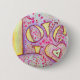 Watercolor painting of the golden yellow word "Love" with a double heart. Pink and purple highlights the letters and heart. A light splash of glitter across the top gives the painting a sparkly glow.