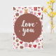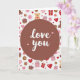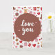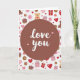 This greeting card features a deep reddish-brown circular medallion centered on the front, drawing your eye straight to the message “love you” in bright white lettering, with two small pink hearts nearby 🥰❤️. Behind it, a white background is filled with a scattered pattern that feels like little moments of romance and friendship happening all at once. Red and soft pink hearts—some filled in and some outlined—float around like quiet reminders of affection. Golden-brown teddy bears sit calmly with red hearts on their bellies, giving the scene a cozy, caring look. Rose and ruby gift boxes with neat bows add the sense of sweet surprises being shared. Soft pink roses appear between the other icons, their petals open as if they’ve just been placed there for someone special. The pattern also includes donut-like rings in pink tones, dotted evenly across the white space around the central circle.