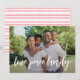 Simple, fun, modern photo holiday card reading LOVE PEACE FAMILY in stylish brush script, with your name and year below. On the back are hand drawn watercolor stripes in festive red.