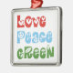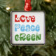 Love, Peace, Green custom ornament, featuring the words Love, Peace, Green with fun fonts with hearts, the 60’s sign of peace and leaves.