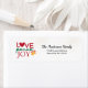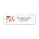 Christmas address labels feature an inspirational message, "Love, Peace and Joy" written in red and green with holiday bells, bows and a heart all sprinkled with gold dust.