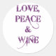 "Love, Peace & Wine" text in a fancy distressed urban font, purple colour