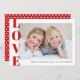 A simple, classic photo valentine's day card with stacked red love on a clean, modern white background. The accompanying pattern backer has a repeating heart pattern in red and white. Valentine's day cards are the perfect way to send love and make up for missing the holiday rush of christmas and new years cards. It's sometimes hard to get it all done and things have usually slowed down by Valentine's day and you can plan sending out cards a little easier. It's unexpected when they show up in the mail making them extra special. Plus they don't have all those holiday cards to compete with so they really stand out.