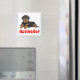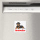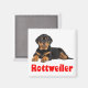 Rottweiler love! This fun canine magnet features a hand drawn brown and black Rottweiler puppy dog cartoon with Rottweiler printed in a bold red font highlighted against a crisp white background.