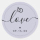 Save the date with script love, date and graphic wedding rings in light lavender purple sticker.