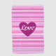 Love in handwritten script in white on a plum colour heart on pinks, white and plum colour stripes.