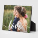 Simple and modern wedding photo keepsake plaque features your favourite horizontal or landscape orientated photo with "love" as a white text overlay in hand lettered calligraphy script.