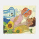 Artist:Bernard D'Andrea | Red-haired lady kissing man behind sunflowers with a blue chair and a cat.