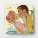 Artist:Bernard D'Andrea | Red-haired lady kissing man behind sunflowers with a blue chair and a cat.