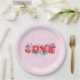 Paper plates with Love written in a bold block-style font surrounded by beautiful flowers. Created with watercolors. Light pink patterned background.