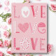 Love text in pink shades with hearts and flowers holiday card