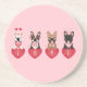 Illustration of three French Bulldog puppies of different colours popping out of hearts dressed in Valentine's Day attire.
