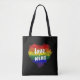 Custom pride slogan tote bag. Black tote decorated with a cute heart artistically painted in the colours of the pride rainbow. Love wins text is printed in bold white calligraphy script over the heart. The text can easily be personalised. Feel free to edit it and replace it with a short slogan that expresses your views and ideas the best.