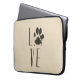 A laptop sleeve with a cute illustration of a sketched dog paw print in brown with a grunge style. The letters spell out the word "Love" with the paw print in place of the letter "o". Awesome for pet lovers.