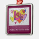 Watercolor painting of word "Love" with overlapping heart in a patchwork pattern. Painting has a light layer of golden glitter. There is another version of this painting without glitter called "Love Patchwork Hearts Watercolor". The inspirational word painting series are taken from the text used in the angel paintings. "I choose to know love" -My Life, My Choice "In my life I choose to know my love" -Feel Beauty "It cannot cripple love" -What Cancer Cannot Do These images are designed so as to provide reflection and meditation on a single word. You can also combine them together to make your own word series for meditation/ contemplation. Personalise this ornament with your own text and images using the "Customise" button.