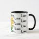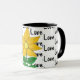 Golden yellow floral with green leaves. Love is written in black script all over background pattern. Original Artwork © TamiraZDesigns.