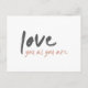 Modern, minimalist “Love you as you are” inspirational quote postcard in a stylish off black with dusky blush pink accent in a hand painted style typography with Scandinavian minimalism style and inspired by romance, encouragement, inspiration, motivation, friendship, kindness and travel.